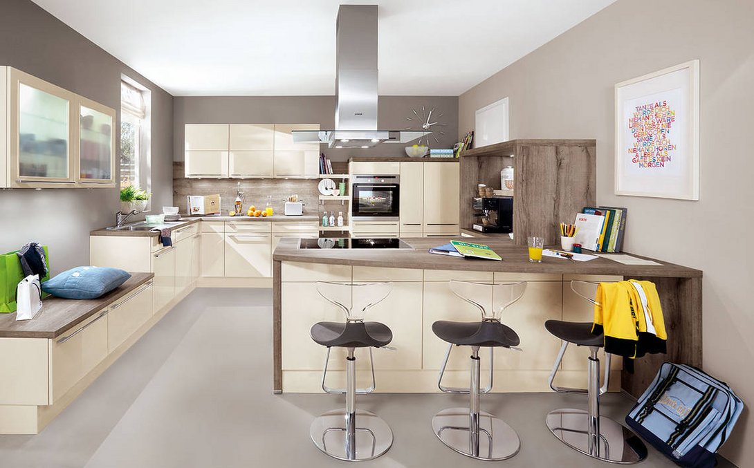 Das Highlight der Familienküche ist die Kochinsel, welche den Raum strukturiert und die Möglichkeit bietet, dass Familie und Gäste gesellig beim Kochen dabei sein können. So wird die Küche zum Mittelpunkt des Familienlebens. Viele Schubladen und Auszüge, beispielsweise unter dem Kochfeld oder versteckt in der kleinen Sitzgelegenheit, bieten viel Stauraum, der gerade in einer Familienküche besonders benötigt wird. Die Kochinsel mit origineller Tresenform bietet Sitzmöglichkeiten zum Essen, Arbeiten, Spielen oder Hausaufgaben machen. Die gemütliche Bank am Fenster lädt zusätzlich zum Sitzen in der Familienküche ein.